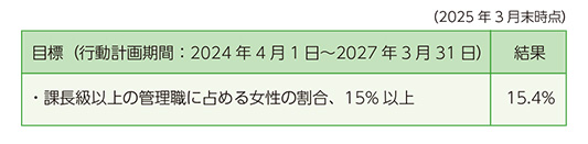 また、「女性の職業生活における活躍の推進に関する法律(女性活躍推進法)」に基づき策定した行動計画のうち数値目標を掲げた取り組みの結果は下記のとおりです。今後も女性社員や女性管理職が誇りを持って活躍できる組織を目指します。