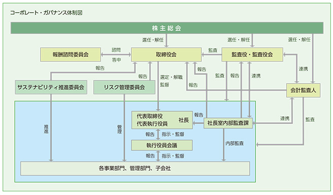 また、リスク管理や内部統制システムの整備等を通じて内部管理体制の強化にも努めています。具体的には、内部統制基本方針や法令等遵守行動基準などに基づいた健全な企業活動を推進し、コーポレート・ガバナンスの充実を図っています。