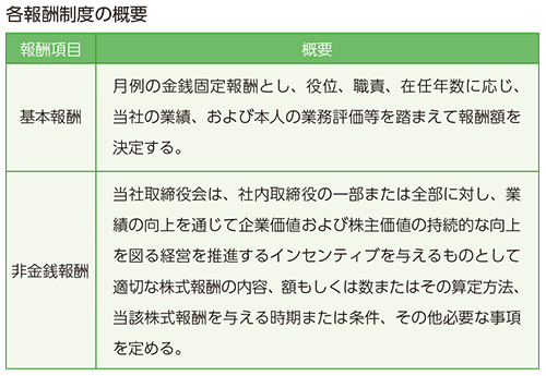 具体的には、社内取締役の報酬等は金銭固定報酬を基本とし(以下、基本報酬)、不定期に非金銭報酬の支給を決定します。社外取締役については、その職務に鑑み、基本報酬のみを支払います。